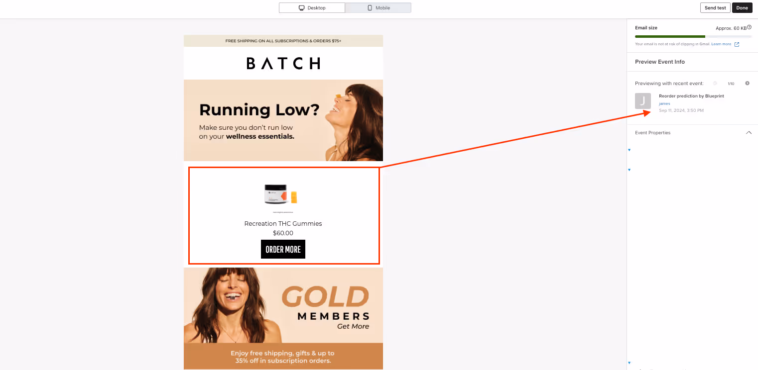 Here’s an example of a BATCH email with personalized predictions for the customer. The product recommendations are tailored to each customer, as shown in the Klaviyo preview on the right. In this case, Relo predicted James might want to reorder "Recreation THC Gummies" based on his previous purchases.