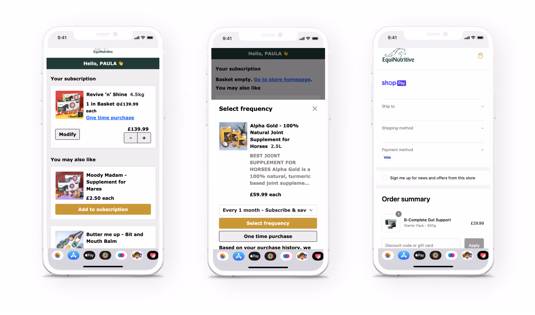 Once Equinutritive had highlighted which customers were ready to try a subscription and connected that data to Klaviyo - the last step was conversion to subscription. The previously clunky experience where customers were taken from a CTA in a Klaviyo email, through to a product page, to a cart page and then an empty checkout wouldn't cut it here.