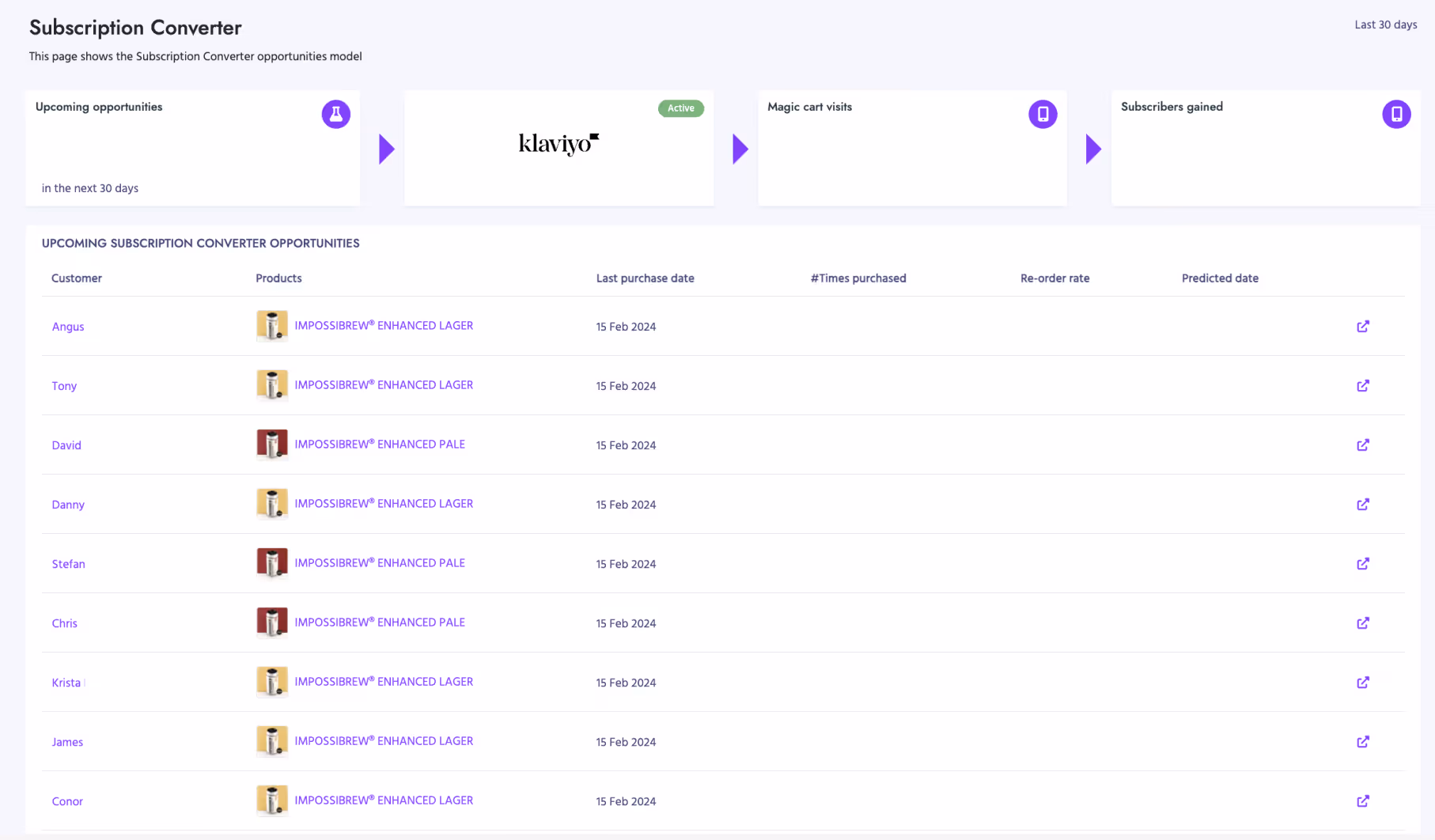 Here is an example of how those customer predictions looked for IMPOSSIBREW (Anonymised). Within minutes, they had a really specific list of who's ready to target, when, and with which product: