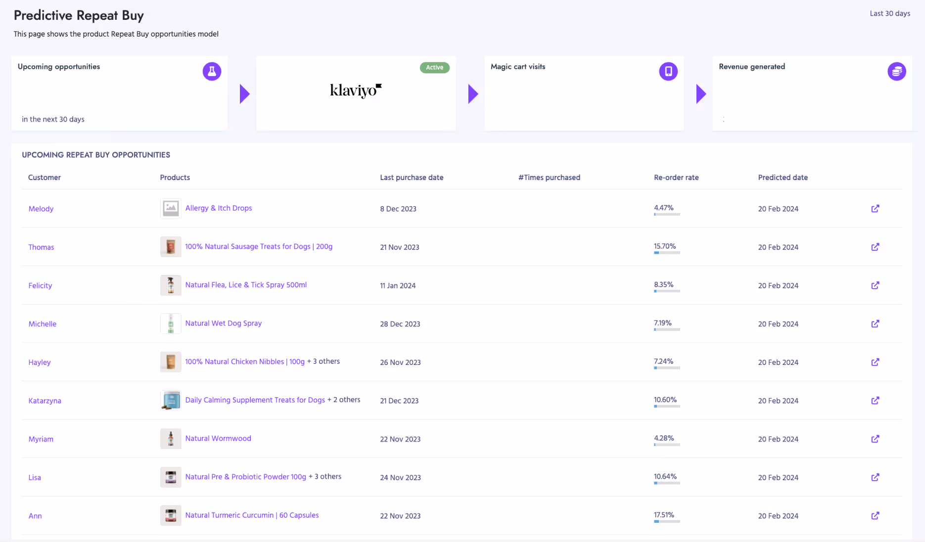 Relo then automatically synced those predictions straight to Pets Purest Klaviyo dashboard, immediately making them actionable and driving revenue straight away: